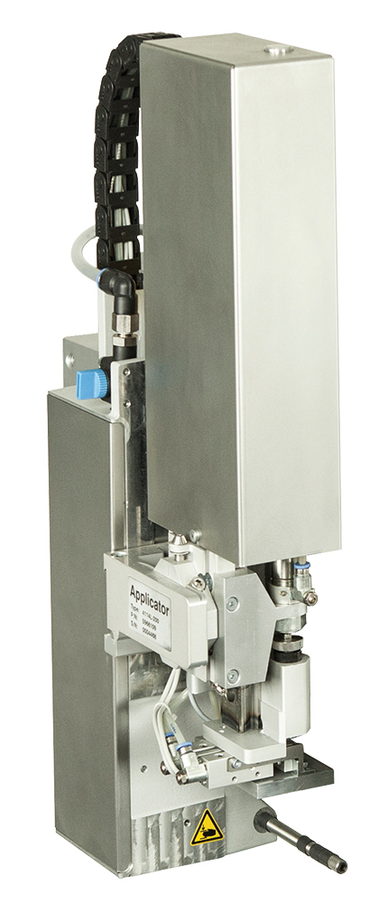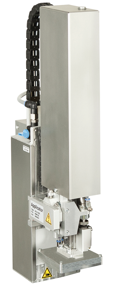 Ipari címkéző- (label applicator / label dispenser) gép, amelyet automatizált gyártósorokon használnak címkék felhelyezésére.