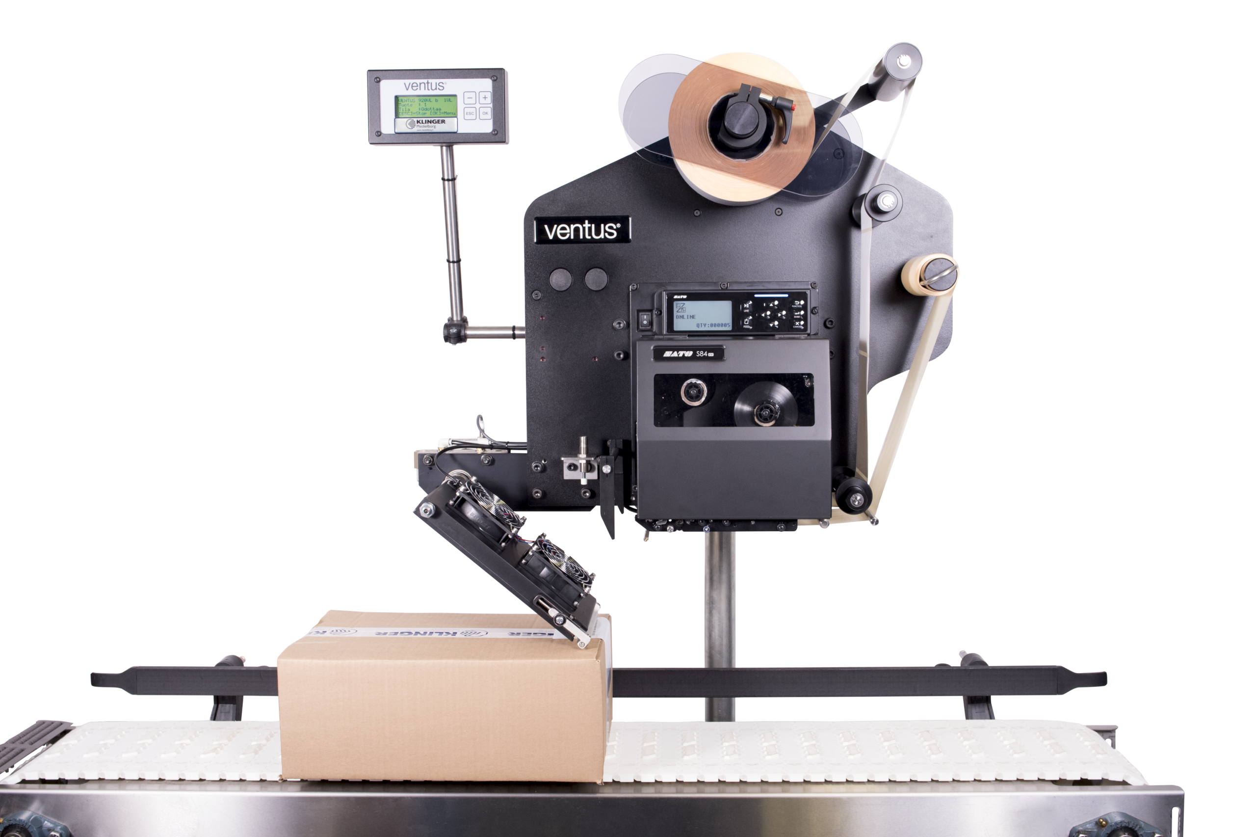 A Ventus 920VL az utoljára kinyomtatott címkét a mozgó termékre helyezi fel. Követi a termék felületét, amely biztosítja, hogy a címkét gondosan és alaposan rögzítsék a termékhez. A felhordó fej szerkezete úgy van megtervezve, hogy ugyanaz a fej felhasználható legyen különféle méretű címkék felhelyezésére további beállítások nélkül.